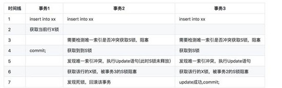 這個(gè)就是整個(gè)死鎖的原因,能出現(xiàn)這種死鎖的還有一個(gè)情況,就是同一時(shí)間來三個(gè)插入操作,其中先插入的那個(gè)事務(wù)如果最后回滾了,其余兩個(gè)事務(wù)也會出現(xiàn)這種死鎖。