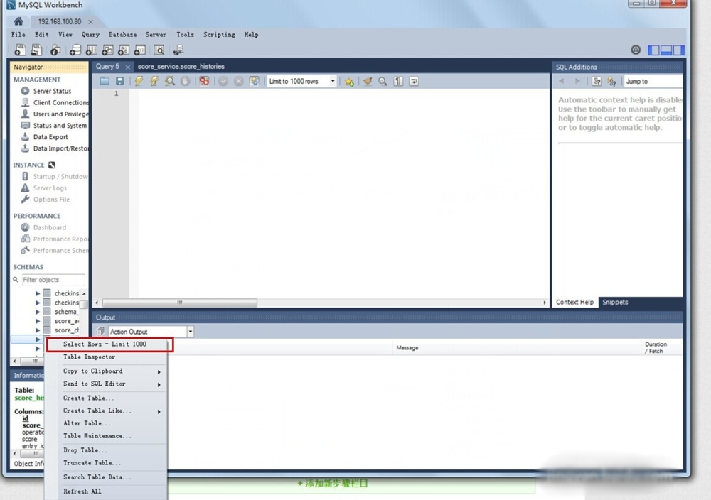 在展開的數(shù)據(jù)表上方點擊鼠標(biāo)右鍵,可以針對數(shù)據(jù)表做的一些操作,如下圖,小編選擇第一個select rows limit 1000,查詢出這個表格中的1000條數(shù)據(jù)。