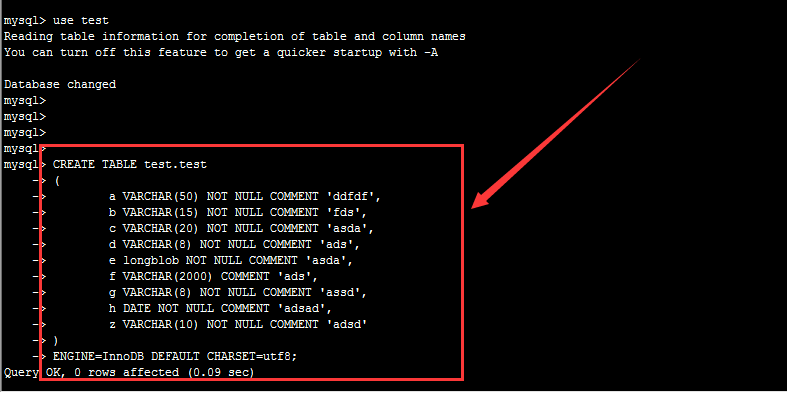 z VARCHAR(10) NOT NULL COMMENT 'adsd'