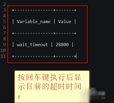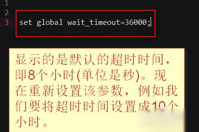 4.顯示的是默認的超時時間,即8個小時(單位是秒)。現(xiàn)在重新設(shè)置該參數(shù),例如我們要將超時時間設(shè)置成10個小時。