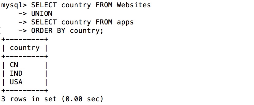 mysql> SELECT * FROM apps; +----+------------+-------------------------+---------+ | id | app_name | url | country | +----+------------+-------------------------+---------+ | 1 | QQ APP | http://im.qq.com/ | CN | | 2 | 微博 APP | http://weibo.com/ | CN | | 3 | 淘寶 APP | https://www.taobao.com/ | CN | +----+------------+-------------------------+---------+ 3 rows in set (0.00 sec)