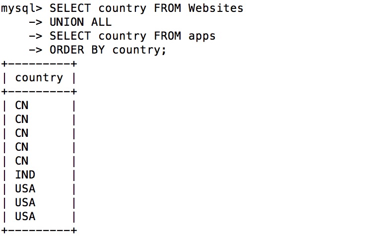 注釋:UNION 不能用于列出兩個(gè)表中所有的country。如果一些網(wǎng)站和APP來自同一個(gè)國家,每個(gè)國家只會(huì)列出一次。UNION 只會(huì)選取不同的值。請(qǐng)使用 UNION ALL 來選取重復(fù)的值!