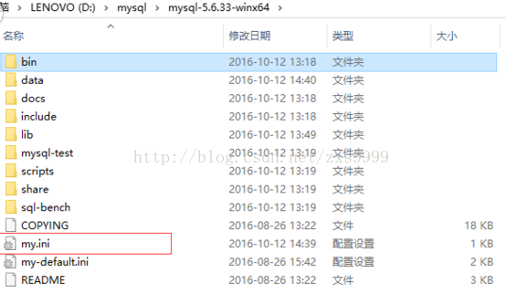 在D:\mysql\mysql-5.6.33-winx64\(注意這個(gè)目錄要和你自己的目錄,我這里下載的是5.6版本,要是你下載的是5.5版本,這個(gè)目錄是不一樣的)目錄下新建一個(gè)配置文件,文件名叫my.ini,然后把下面的配置代碼復(fù)制到在my.ini(代碼中的路徑要改成自己的文件存放路徑)。如圖: