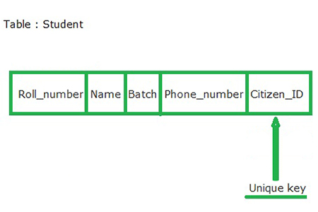為了更好地理解唯一鍵,我們使用帶有Roll_number,Name,Batch,Phone_number和Citizen_ID屬性的Student表;其中Roll_number屬性已經(jīng)給主鍵。