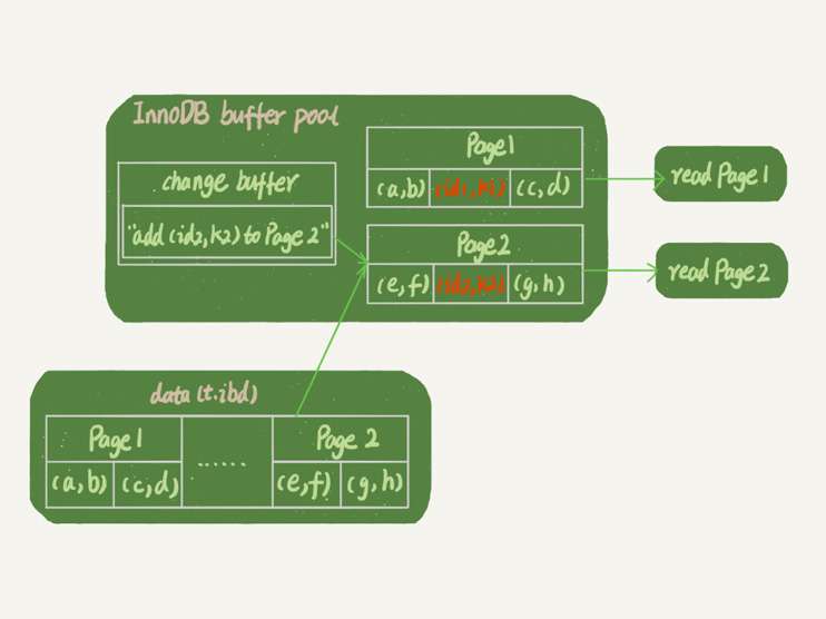 2、Page 2不在內存中,在changer buffer中記錄:add (id2,k2) to Page 2