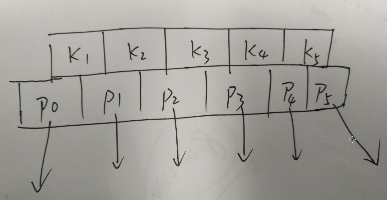 3,每個節(jié)點(diǎn)中的k個關(guān)鍵字是按照從小到到排列的,分別記為k1,k2,k3,......kk。那么該節(jié)點(diǎn)會有k+1個指針,記為p0,p1,p2,......pk。并且,p3所指向的子節(jié)點(diǎn)中的所有元素,都大于k3,且都小于k4. 如下圖所示。這一點(diǎn)也比較容易理解和記憶,各個指針p整好位于關(guān)鍵字k的插空的位置,所以,插空處的指針指向的子節(jié)點(diǎn)的元素的值,就理所當(dāng)然的應(yīng)該大于指針左邊的元素,小于指針右邊的元素。