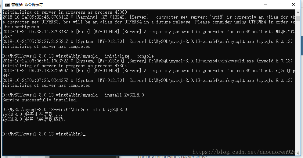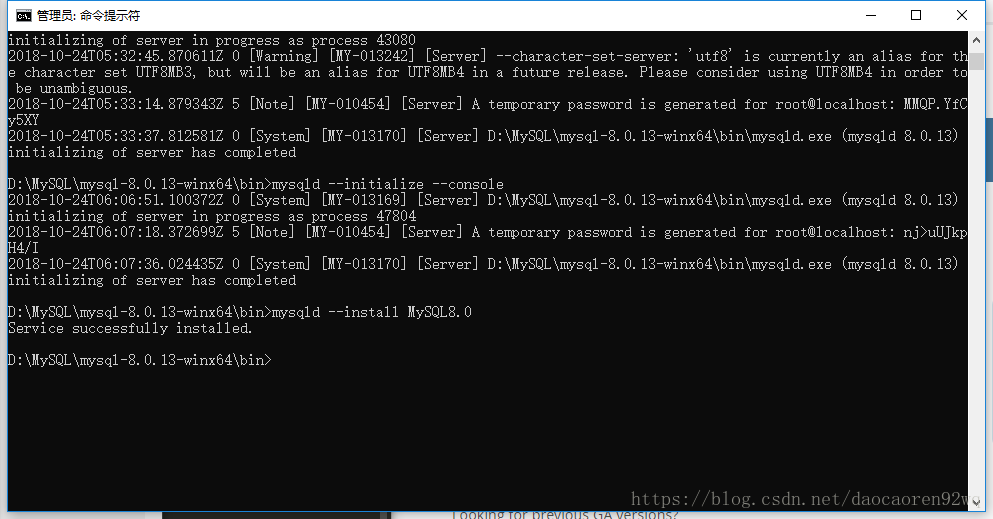 D:\MySQL\mysql-8.0.13-winx64\bin>mysqld --initialize --console 2018-10-24T05:32:45.732454Z 0 [System] [MY-013169] [Server] D:\MySQL\mysql-8.0.13-winx64\bin\mysqld.exe (mysqld 8.0.13) initializing of server in progress as process 43080 2018-10-24T05:32:45.870611Z 0 [Warning] [MY-013242] [Server] --character-set-server: 'utf8' is currently an alias for the character set UTF8MB3, but will be an alias for UTF8MB4 in a future release. Please consider using UTF8MB4 in order to be unambiguous. 2018-10-24T05:33:14.879343Z 5 [Note] [MY-010454] [Server] A temporary password is generated for root@localhost: MMQP.YfCy5XY 2018-10-24T05:33:37.812581Z 0 [System] [MY-013170] [Server] D:\MySQL\mysql-8.0.13-winx64\bin\mysqld.exe (mysqld 8.0.13) initializing of server has completed D:\MySQL\mysql-8.0.13-winx64\bin>