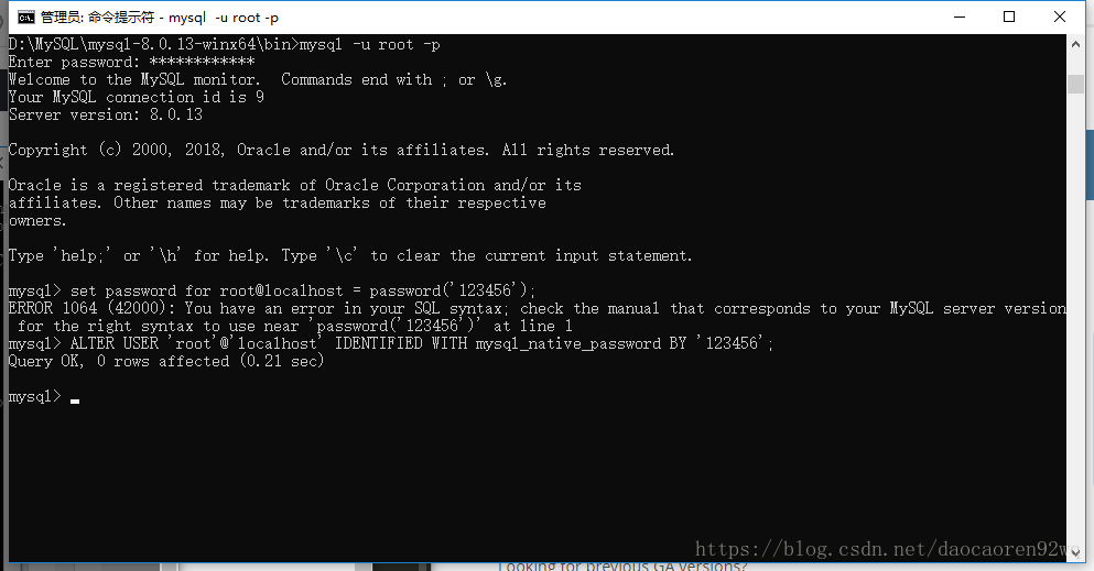 D:\MySQL\mysql-8.0.13-winx64\bin>mysqld --initialize --console 2018-10-24T06:06:51.100372Z 0 [System] [MY-013169] [Server] D:\MySQL\mysql-8.0.13-winx64\bin\mysqld.exe (mysqld 8.0.13) initializing of server in progress as process 47804 2018-10-24T06:07:18.372699Z 5 [Note] [MY-010454] [Server] A temporary password is generated for root@localhost: nj>uUJkpH4/I 2018-10-24T06:07:36.024435Z 0 [System] [MY-013170] [Server] D:\MySQL\mysql-8.0.13-winx64\bin\mysqld.exe (mysqld 8.0.13) initializing of server has completed D:\MySQL\mysql-8.0.13-winx64\bin>