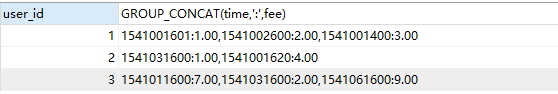 select user_id,GROUP_CONCAT(time,':',fee) from consumption group by user_id