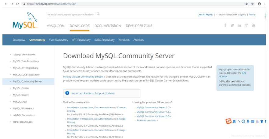 登錄mysql官網(wǎng)(https://www.mysql.com/)-->Downloads(最上面)-->community(Downloads下面)-->MySQL Community Server(最左邊)-->