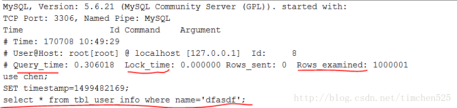 該條語(yǔ)句即是慢查詢語(yǔ)句,之后,便可以在相應(yīng)的日志輸出文件或表中去查看是否有該條語(yǔ)句。