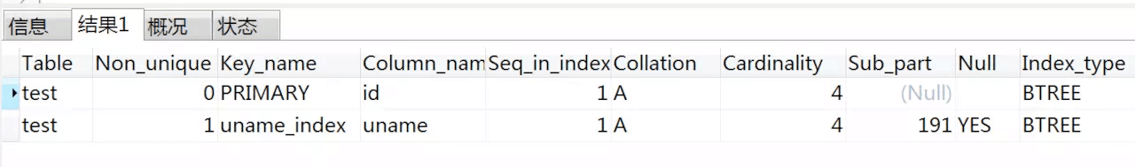 -- 查看是否有索引 SHOW INDEX FROM test;