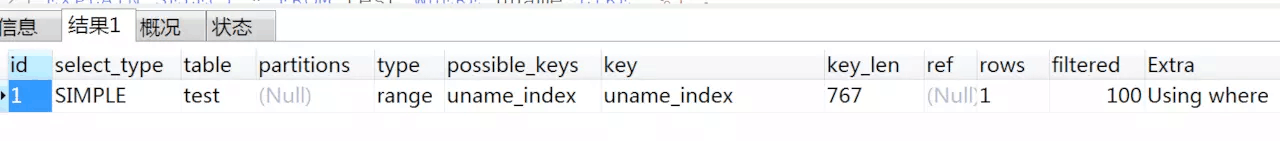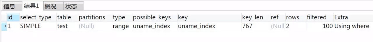 可以看出:type的值為:range,key的值為uname_index,也就是說這種情況下,使用了索引。