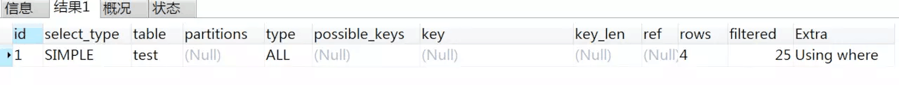 可以看出:type的值為ALL,key的值為NULL,同樣沒用到索引。