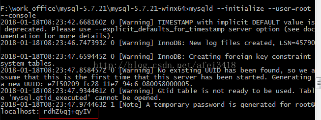 4、初始化mysql數(shù)據(jù)庫,輸入“mysqld --initialize --user=root --console”。下面紅色文字為初始化后的root 密碼