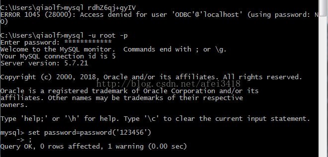 6、使用生成的密碼登錄mysql,通過“set password=password('123456')”修改密碼。此處將root密碼設(shè)置為123456