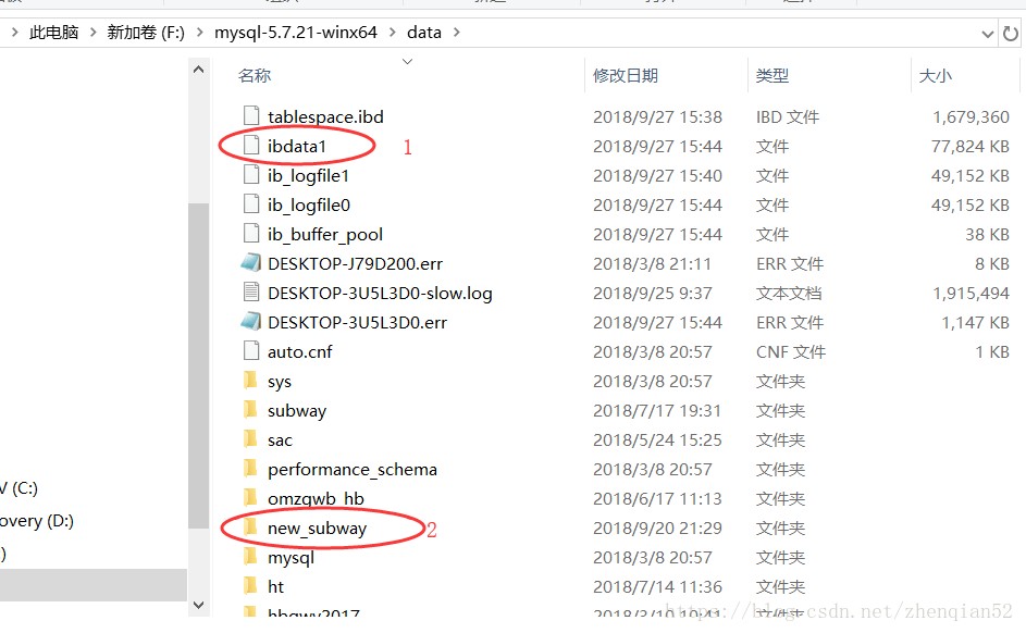 1.找到之前(我之前一直啟動(dòng)不成功路徑F:\mysql-5.7.21-winx64)的數(shù)據(jù)庫目錄下的data文件夾,目錄如下: