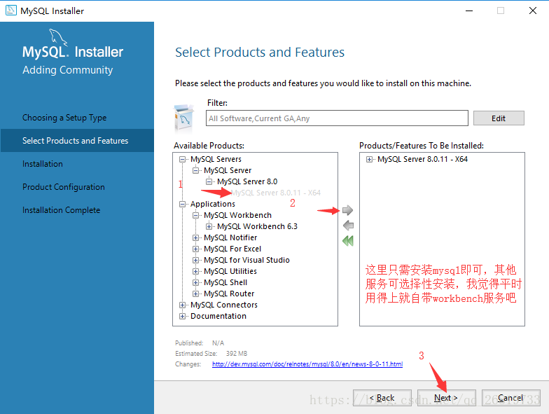 先責(zé)mysql server,添加到to be installed處,接著next下一步。