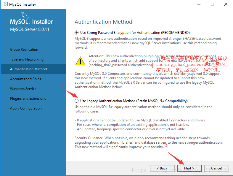 沒什么必要還是選擇以前的加密方式把,剛出來8.0,第三方客戶端基本都不支持這種加密方式,但自帶的命令行支持,當(dāng)然我推薦的是開發(fā)環(huán)境這樣子,服務(wù)器端你自己考慮吧,開發(fā)環(huán)境老的加密方式不會(huì)有坑,選擇Use Legacy Authentication Method,然后next,下一步