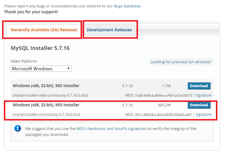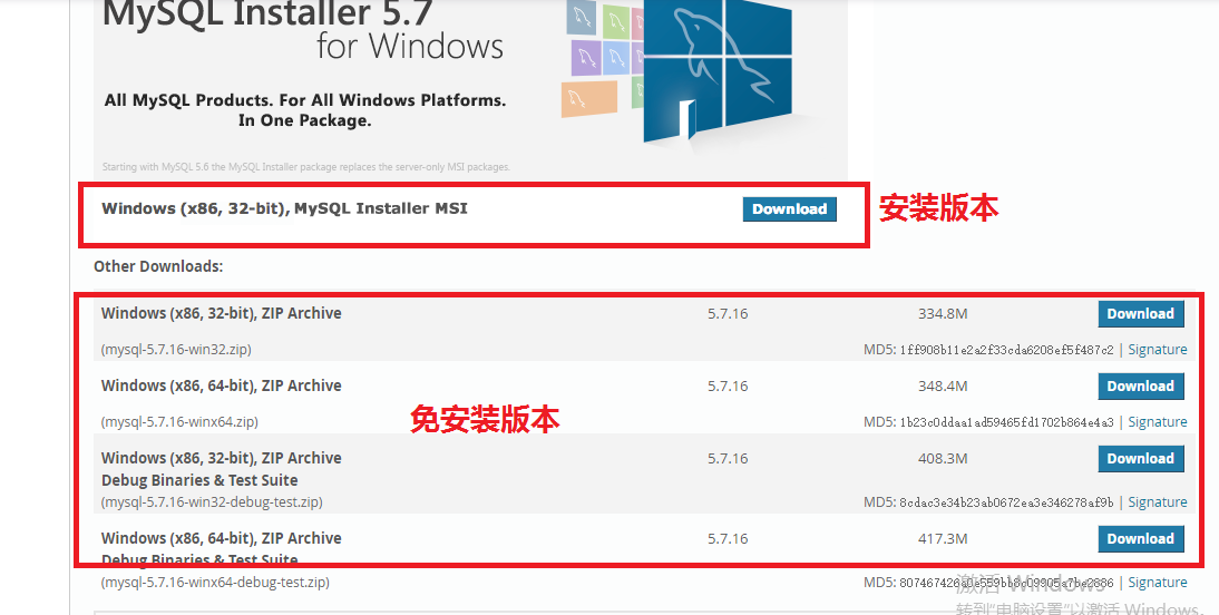進(jìn)入到MySql官方網(wǎng)站,進(jìn)入到下載界面??吹竭@個(gè),選擇“MySQL Installer 5.7.16”,而不是“MySQL Installer 8.0.0 dmr”,選擇“Windows (x86, 32-bit), MSI Installer” 385.2M的那個(gè)版本。
