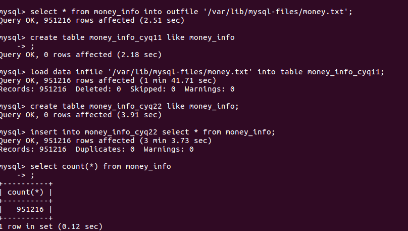 >select * from money_info into outfile '/var/lib/mysql-files/money.txt'; >create table money_info_cyq11 like money_info; >load data infile '/var/lib/mysql-files/money.txt' into table money_info_cyq11;