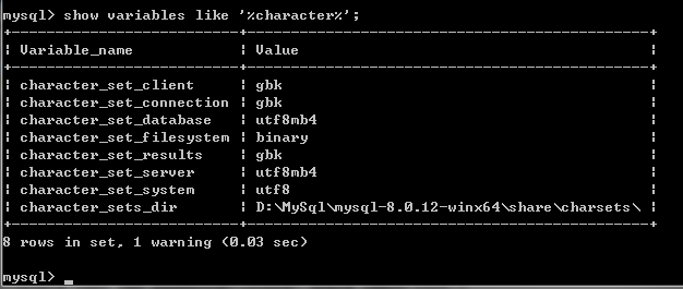 3、運(yùn)行命令show variables like "%character%"查看系統(tǒng)字符集變量,如下圖: