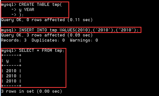 向表中插入數(shù)據(jù):INSERT INTO tmp VALUES(2010),('2010'),("2010");