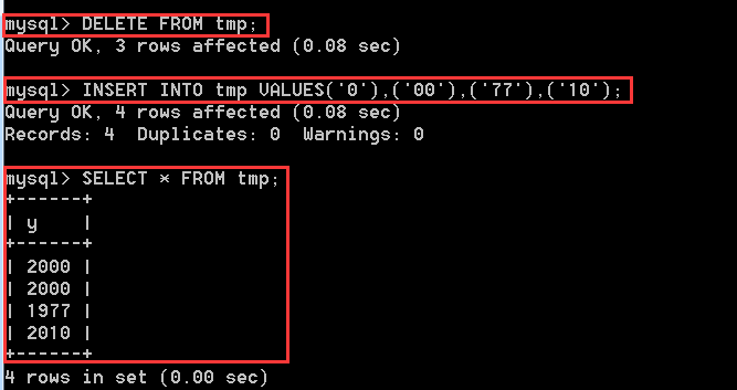 例子一:就拿上面那張tmp表來(lái)說(shuō)。向表中插入用字符串代表的YEAR值,''0' 、'00'、 '77'、 '10'