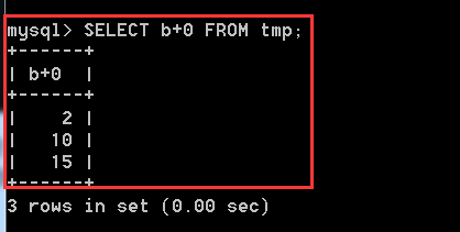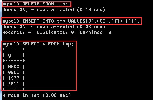 向表中插入數(shù)據(jù):INSERT INTO tmp VALUES(0),(00),(77),(11);