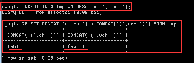 SELECT concat( '(', ch ,')' ),concat( '(',vch,')' ) FROM tmp;//這句話的意思就用(將結(jié)果包起來(lái),用來(lái)觀察輸出的字符長(zhǎng)度)