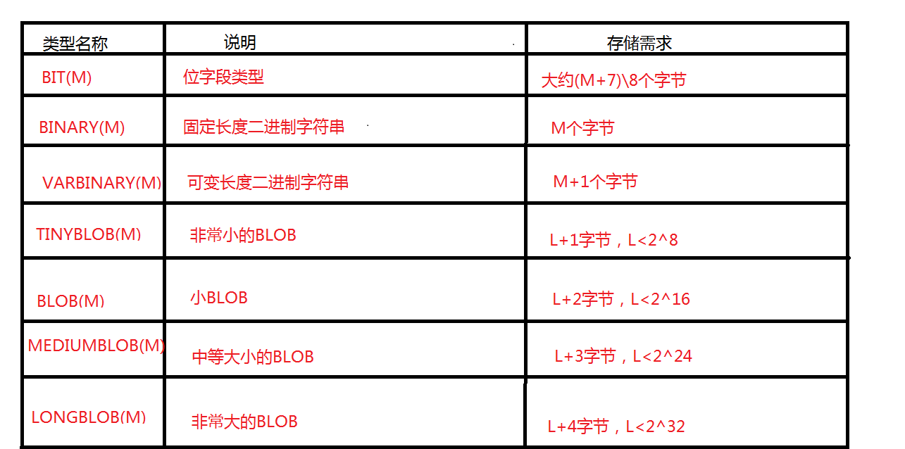 用來(lái)存放二進(jìn)制數(shù),也就是01010這種。有BIT、BINARY、VARBINARY、TINYBLOB、BLOB、MEDIUNBLOB和LONGBLOB