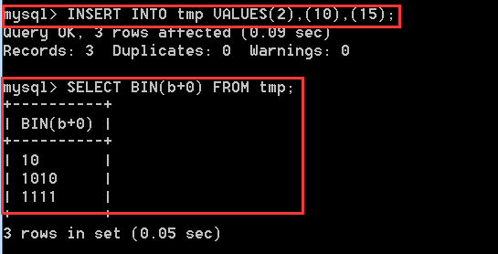 解釋:我們將2,10,15這三個(gè)10進(jìn)制存入數(shù)據(jù)表中,其字段為BIT類(lèi)型,所以在表中存放的是二進(jìn)制數(shù),但是將其顯示出來(lái),要先將二進(jìn)制數(shù)轉(zhuǎn)換為對(duì)應(yīng)的數(shù)字的值,也就是通過(guò)b+0, 然后在通過(guò)BIN()函數(shù)將數(shù)字轉(zhuǎn)換為二進(jìn)制。我們可以嘗試不用BIN()函數(shù),只用b+0,看輸出什么