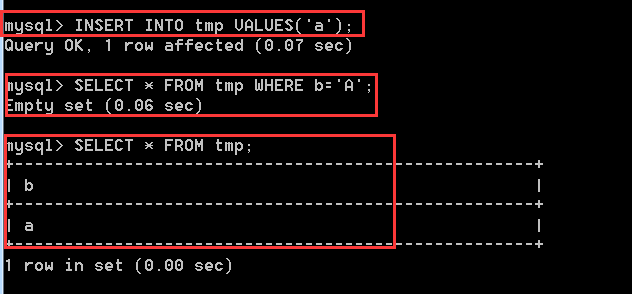 解釋:在tmp表中存放了一個(gè)小寫(xiě)a,然后通過(guò)大寫(xiě)A查找表中,看是否能找到a,結(jié)果找不到,就驗(yàn)證了我們上面的說(shuō)法,具有區(qū)分大小寫(xiě)的功能。
