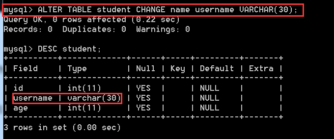 ALTER TABLE student CHANGE name username VARCHAR(30);