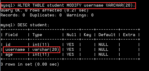 ALTER TABLE student MODIFY username VARCHAR(20);