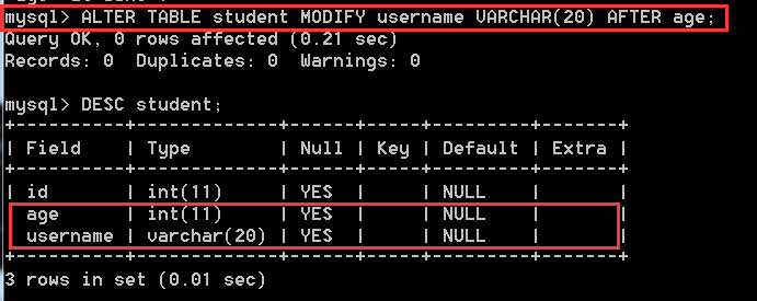 ALTER TABLE student MODIFY username VARCHAR(20) AFTER age;