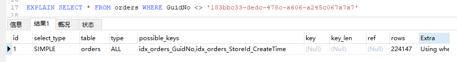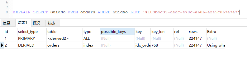 下圖中第一句使用的%,沒(méi)有使用索引,從rows為224147,使用索引rows為1。