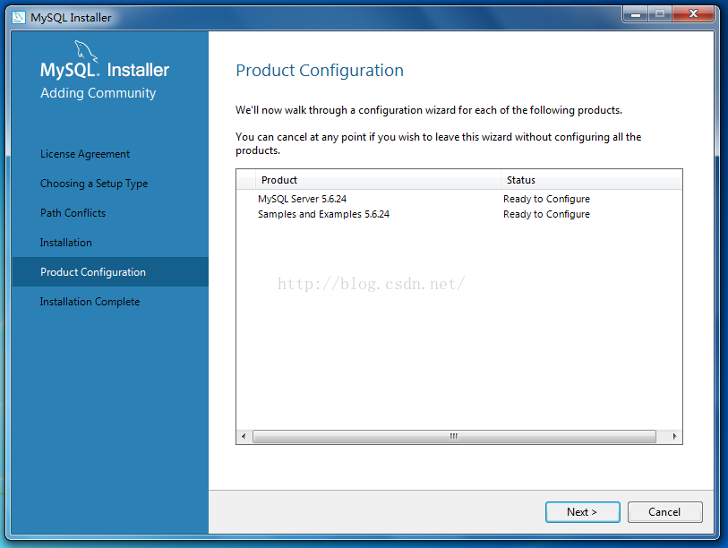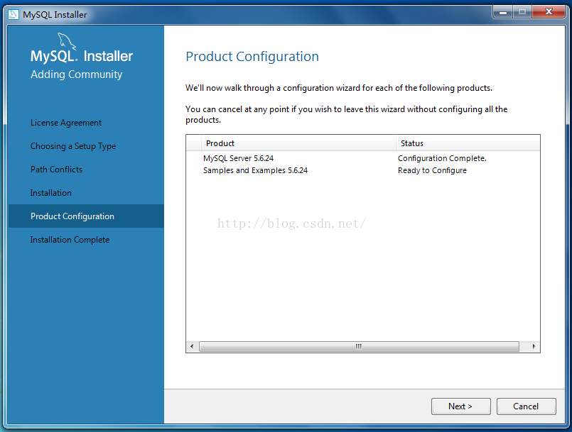 18、進入產(chǎn)品配置,有MySQL Server以及樣例,配置完畢后單擊”Next“