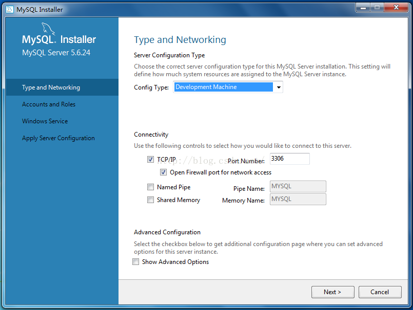 11、配置類型和網(wǎng)絡(luò),選擇配置類型為“Development Machine”,端口號為3306,完成后單擊“Next”