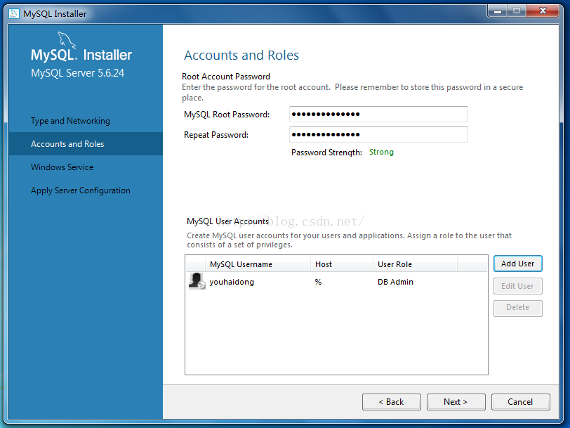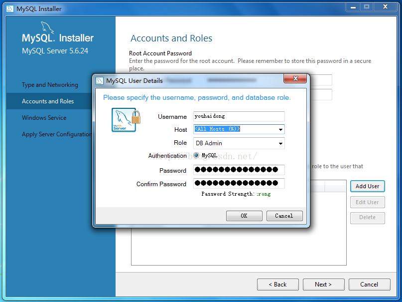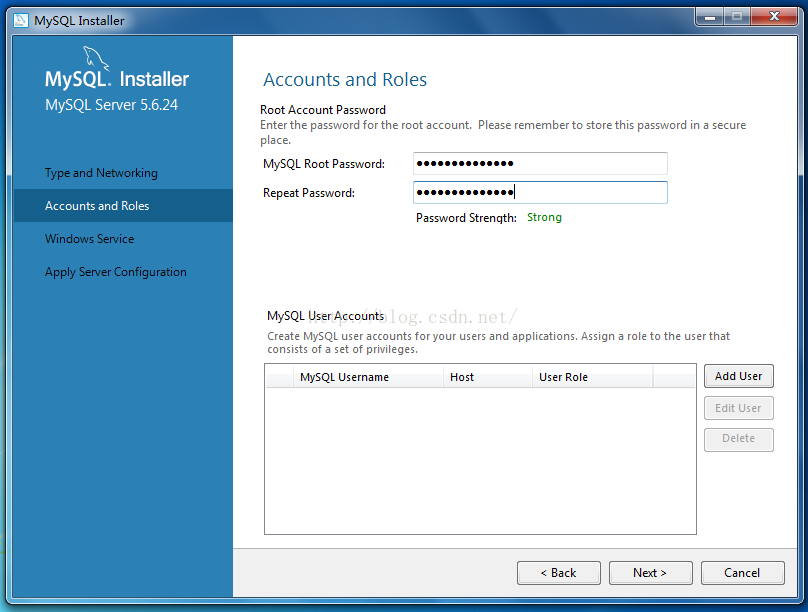 13、點擊MySQL User Accounts下的“Add User”按鈕,添加用戶角色