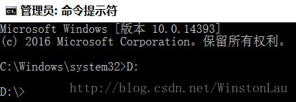2、以管理員身份運行 cmd (將鼠標放在屏幕左下角的 windows 圖標上,點擊鼠標右鍵,選擇命令提示符(管理員)(A)即可),輸入D:,然后回車,進入 D 盤( MySQL 解壓后所在的盤 )