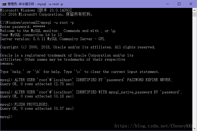 ALTER USER 'root'@'localhost' IDENTIFIED BY 'password' PASSWORD EXPIRE NEVER; #修改加密規(guī)則 ALTER USER 'root'@'localhost' IDENTIFIED WITH mysql_native_password BY 'password'; #更新一下用戶的密碼 FLUSH PRIVILEGES; #刷新權限