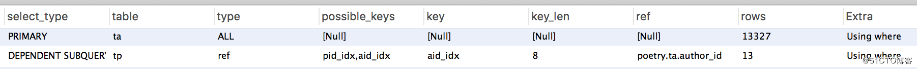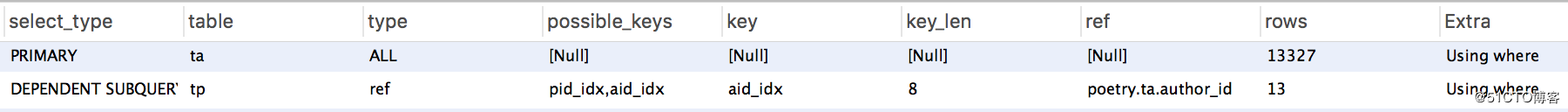 對(duì)t_poetry表的子查詢(xún)結(jié)果集很小,且兩者在t_poetry表都能使用索引,對(duì)t_poetry子查詢(xún)的消耗基本一致。兩者區(qū)別在于,使用 in 時(shí),t_author表能使用索引: