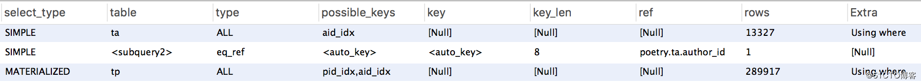 使用in時(shí),由于子查詢(xún)結(jié)果集很大,對(duì)t_author和t_poetry表都接近于全表掃描,此時(shí)對(duì)t_author表的遍歷耗時(shí)差異對(duì)整體效率影響可以忽略,執(zhí)行計(jì)劃里多了一行<auto_key>,在接近全表掃描的情況下,mysql優(yōu)化器選擇了auto_key來(lái)遍歷t_author表: