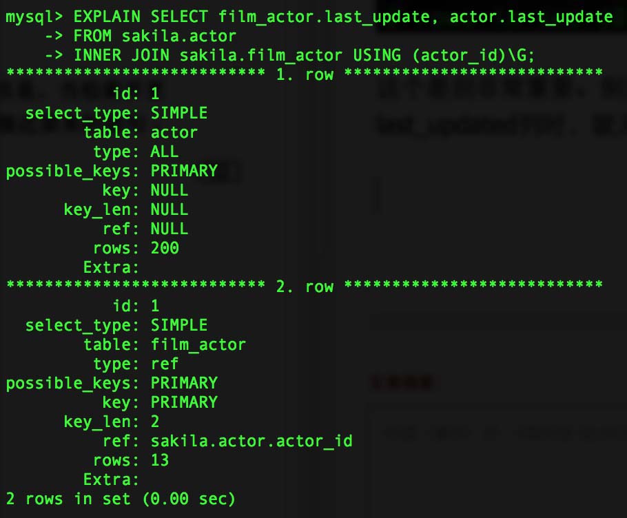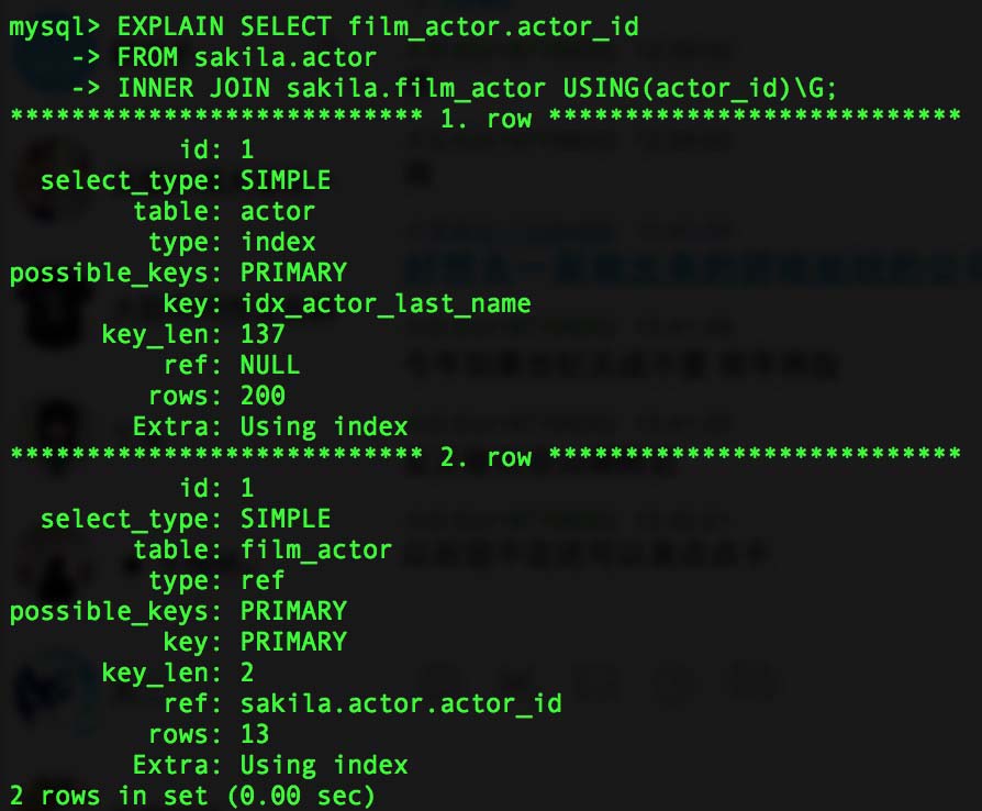 基于結(jié)果中的key_len列,可以推斷出查詢使用唯一的首列——actor_id列,來(lái)執(zhí)行索引查找,當(dāng)我們計(jì)算列的使用情況時(shí),務(wù)必把字符列中的字符集頁(yè)考慮進(jìn)去。