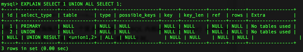 注意第三個(gè)額外的行,union的結(jié)果總是放在一個(gè)匿名臨時(shí)表中,之后mysql將結(jié)果讀取到臨時(shí)表外,臨時(shí)表并不在原SQL中出現(xiàn),因此它的id列為null。