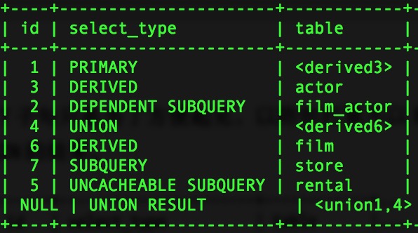 當(dāng)from子句中有子查詢或有union時(shí),table列會(huì)變得復(fù)雜很多,這些場(chǎng)景下,確實(shí)沒(méi)有一個(gè)“表”可以參考到,因?yàn)閙ysql創(chuàng)建的匿名臨時(shí)表僅在查詢執(zhí)行過(guò)程中存在。