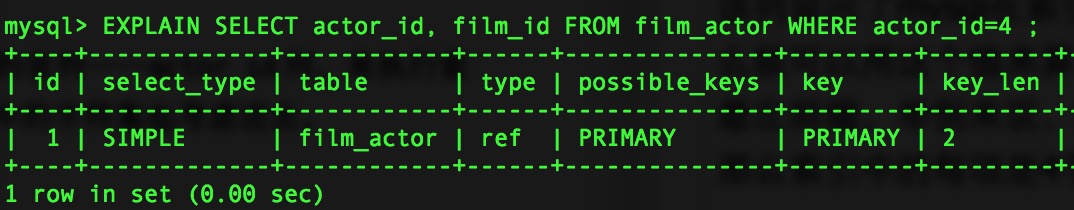 該列顯示了mysql在索引里使用的字節(jié)數(shù),如果mysql正在使用的只是索引里的某些列,那么就可以用這個(gè)值來(lái)算出具體是哪些列,要記住,mysql 5.5及之前的版本只能使用索引的最左前綴,舉例來(lái)說(shuō),film_actor的主鍵是兩個(gè)smallint列,并且每個(gè)smallint列是兩字節(jié),那么索引中的每項(xiàng)是4字節(jié),以下就是一個(gè)查詢的示例: