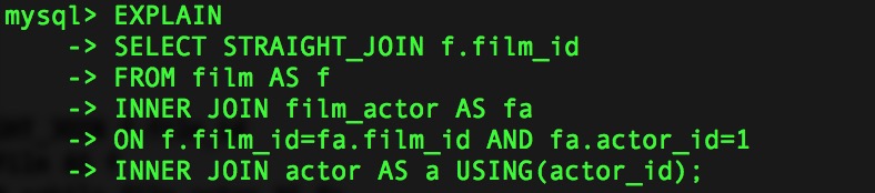 可以在這一列中從上往下觀察mysql的關(guān)聯(lián)優(yōu)化器為查詢選擇的關(guān)聯(lián)順序,例如,可以看到在下面的查詢中mysql選擇的關(guān)聯(lián)順序不同于語(yǔ)句中所指定的順序: