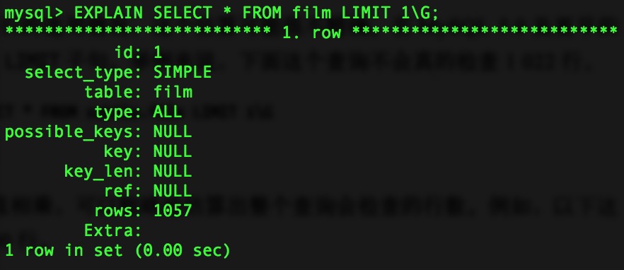 根據(jù)表的統(tǒng)計(jì)信息和索引的選用情況,這個(gè)估算可能很不精確,在mysql5.0及更早的版本里,它也反映不出limit子句,舉例來(lái)說(shuō),下面這個(gè)查詢不會(huì)真的檢查1057行。